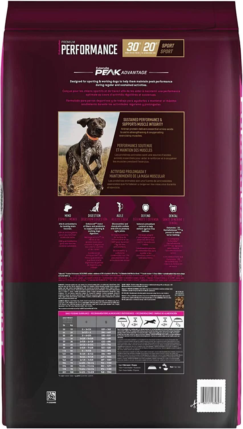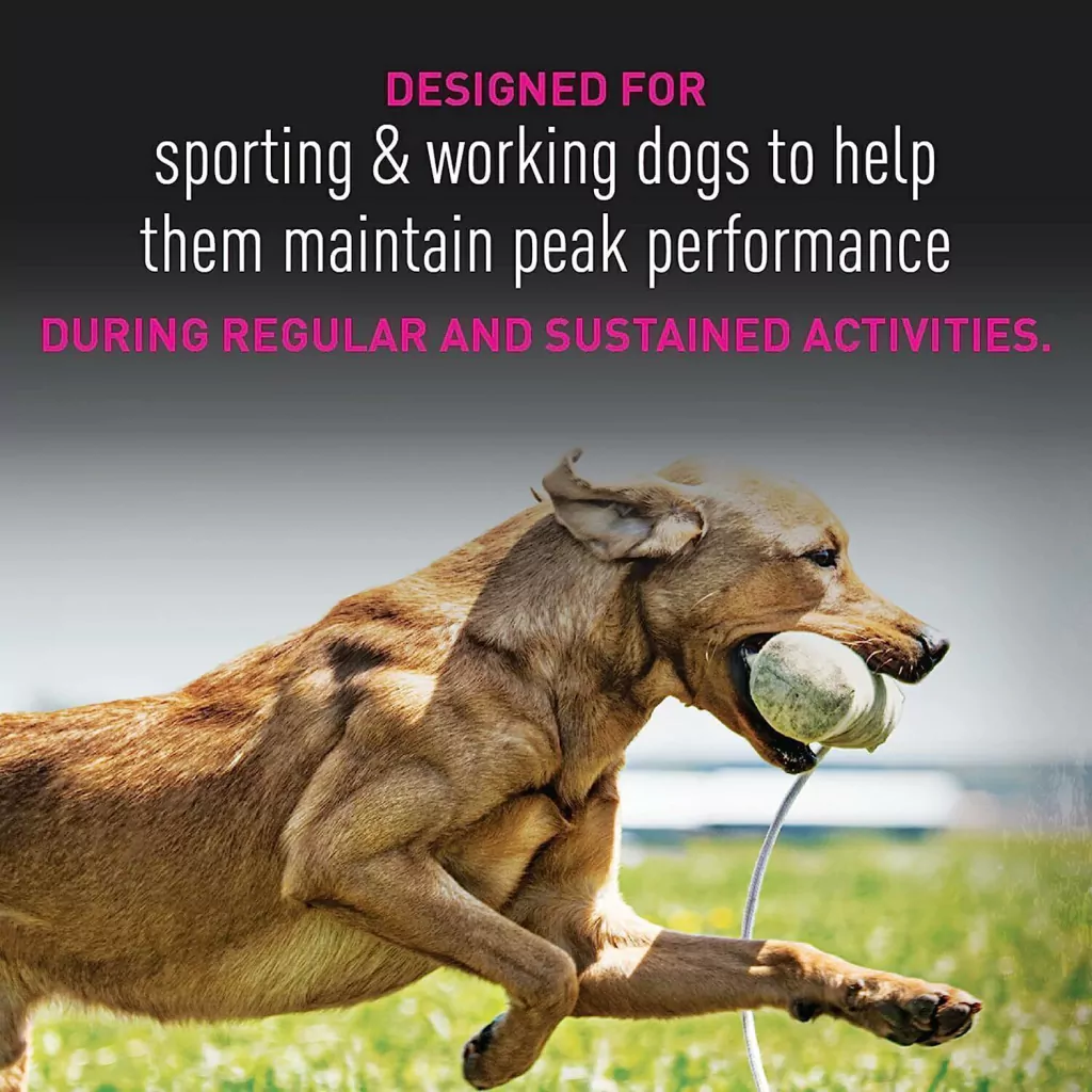 - Formulado para perros deportivos, de seguimiento y de trabajo con una proporción óptima de nutrientes de 30% de proteína y 20% de grasa para ayudar a mantener el máximo rendimiento durante las actividades diarias y sostenidas