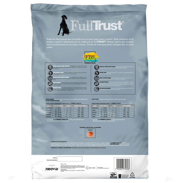 FullTrust alimento para perro adulto raza mediana y grande está especialmente formulado para promover músculos fuertes, articulaciones sanas y un sistema inmune fuerte gracias a la mejor tecnología en nutrición. Gracias a su sistema Full Balance System, FullTrust ayuda a retardar el envejecimiento celular, articulaciones sanas, reforzar el sistema cardiovascular, obtener una piel y pelo brilloso, así como una buena salud digestiva.
