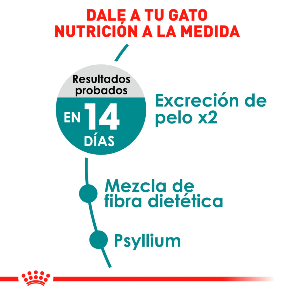 Hairball de Royal Canin es para gatos a partir de 1 año de edad, con mayor predisposición a la formación de bolas de pelo (ej. gatos de pelo largo). Una combinación de diferentes tipos de fibras que estimula el tránsito intestinal y ayuda a facilitar la eliminación del pelo que su gato traga todos los días.
